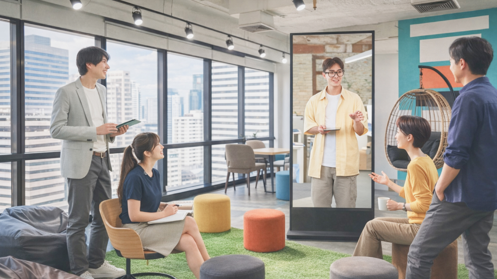 モニターを通じてお互いの空間を共有することで、離れていてもまるで同じオフィスにいるかのような一体感が生まれます。