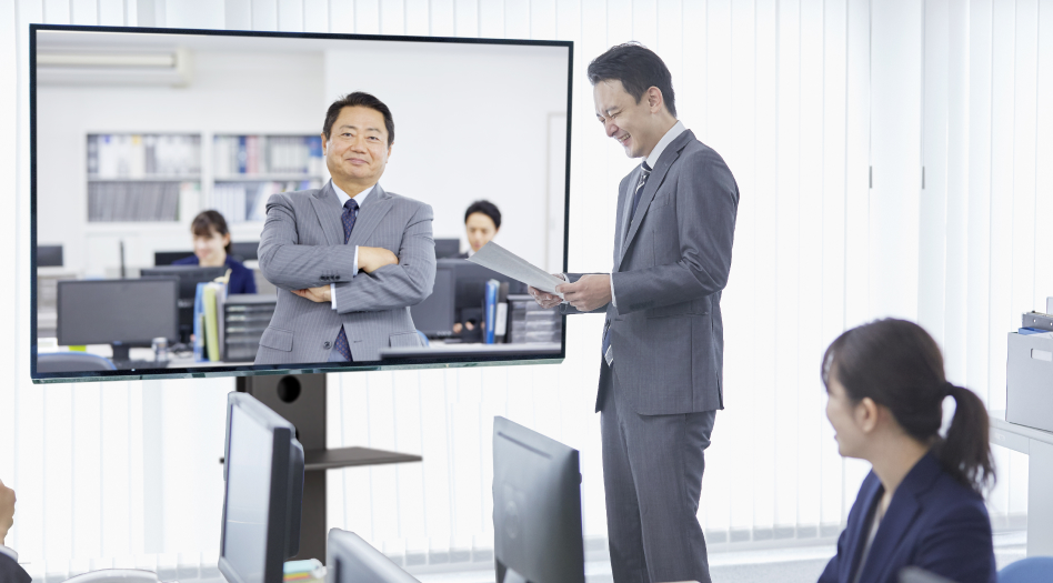空間共有システムは、大画面モニターとビデオ共有ツールを使って、常に社員の様子が見えるようにするシステムです。チャットよりも簡単にコミュニケーションを取ることができ、ITリテラシーに差がある会社や拠点間のコミュニケーション量が多い場合に有効です。