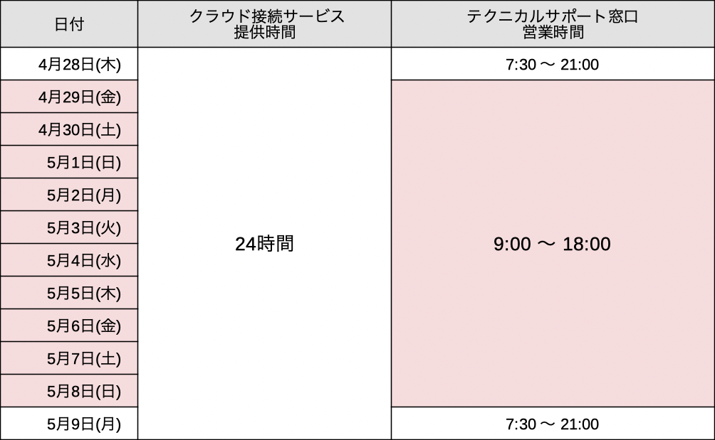 さて、「クラウド接続サービス」はゴールデンウィーク期間も休まずご提供をさせて頂きますが、下記の通り、2022/5/2(月)及び5/6(金)はテクニカルサポート窓口を短縮営業とさせて頂きます。