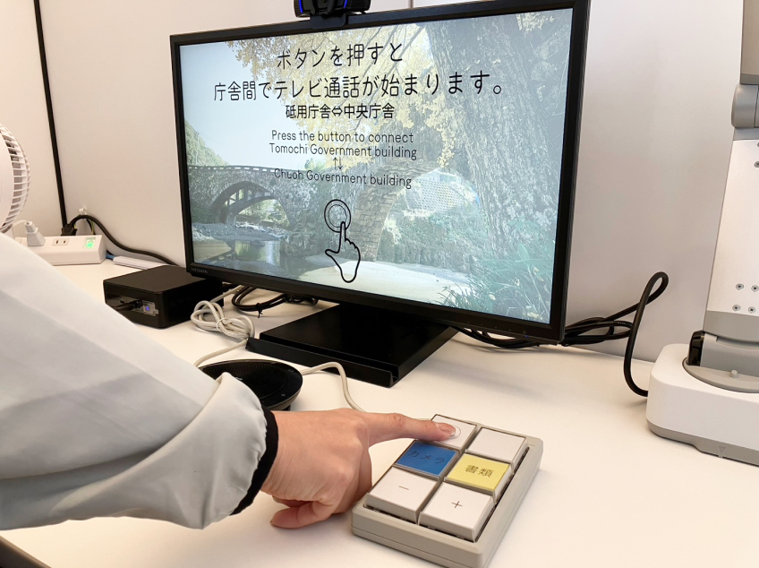 本庁から離れた地域にある支社や出張所でも、本庁窓口と同等のサービスを提供できるようになり、住民の利便性が向上します。専用の「ボタンスイッチ」で、ワンタッチで目的の本庁窓口に簡単に接続できるので誰でも簡単に扱えます